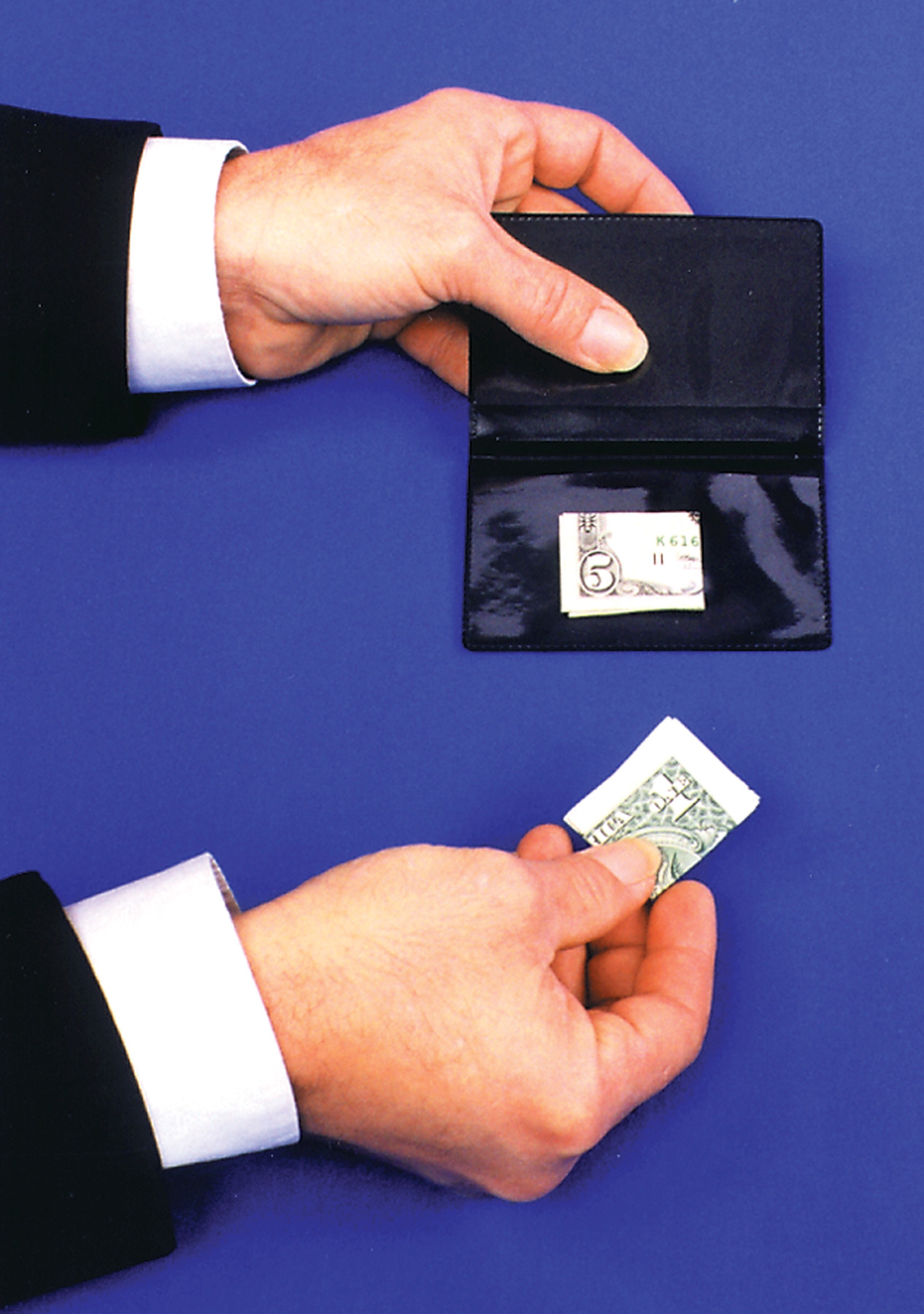 Inside a small vinyl business card case, the performer displays a folded five and a one-dollar bill. The performer gives the five-dollar bill to a spectator to hold in his hand or places it in the spectator's pocket The performer retains the one-dollar bill. Impossible as it seems, the bills change places at the performer's command! Use your own one and five dollar bills. Supplied complete with detailed instructions, the vinyl wallet, and a special gimmick.
