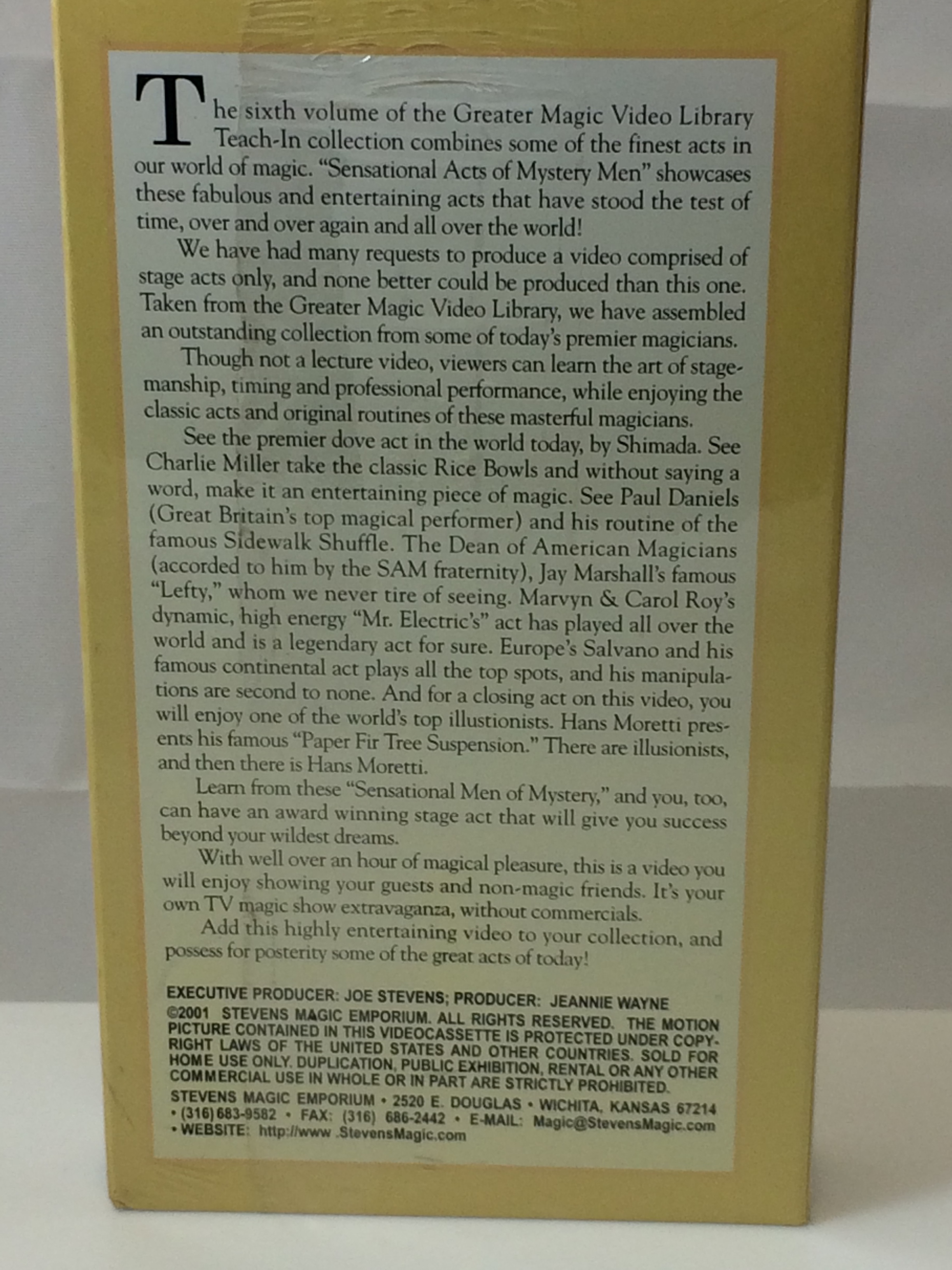 The Sixth Volume in the Greater Magic Video Library Teach-In Series is Sensational Acts Of Mystery Men. This video showcases these fabulous and legendary acts that have stood the test of time...over and over again...all over the world. Seven different effects by seven magical performers are certain to please everyone who views this performance video. Though not a lecture video, one can learn the art of stagemanship and timing, see professionals performing their classic acts and in all cases, their original routines as well. See Charlie Miller take the classic rice bowls and without saying a word make it an entertaining piece of magic. Watch Jay Marshall's favorite friend, Lefty, whom we never tire of seeing. Enjoy Marvyn & Carol Roy's, better known as Mr. & Mrs. Electric, dynamic, high energy act that has played all over the world. See top illusionist, Hans Moretti and his famous Fir Tree Levitation. See Great Britains top magical entertainer, Paul Daniels great routine with Sidewalk Shuffle. And Europes fabulous Salvano and his award-winning act. The premiere dove act in the world, second to none, Shimada. This is a video you will enjoy. Well over an hour of magical pleasure. Classic Routines, Original Illusions, Manipulation At Its Best, Exquisite Showmanship, Check Out The Timing By The Top Professionals Featuring Sensational Acts Of Mystery Men are Charlie Miller, Paul Daniels, Marvyn & Carol Roy, Hans Moretti, Salvano, Shimada and Jay Marshall
