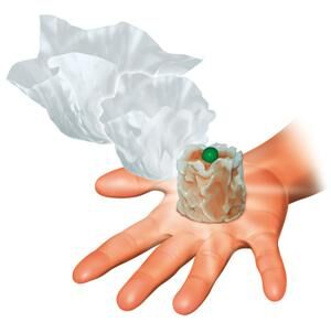 Bunched-up tissue paper transforms into a dumpling! Push a sheet of tissue paper into your closed fist. On top of the tissue, you place a small green ball. Make a magical gesture, and the tissue has transformed into a delicious looking shumai dumpling! The gimmick is a perfect replica of a real shumai, and has been specially manufactured for this trick, through the same process used to create restaurant-quality food samples.